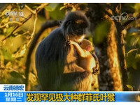 雲南德宏宣傳部表示,攝影愛好者鄭山河在芒市軒崗鄉野外拍攝時,偶然巧遇一群世界瀕危物種、國家一級重點保護野生動物菲氏葉猴,還有看到剛出生小金猴在依偎媽媽懷裡的溫馨畫面,而這群約200多隻的菲氏葉猴數量之多,在全中國極為罕見。(寵物動物 / 2018-01-16 18:17)